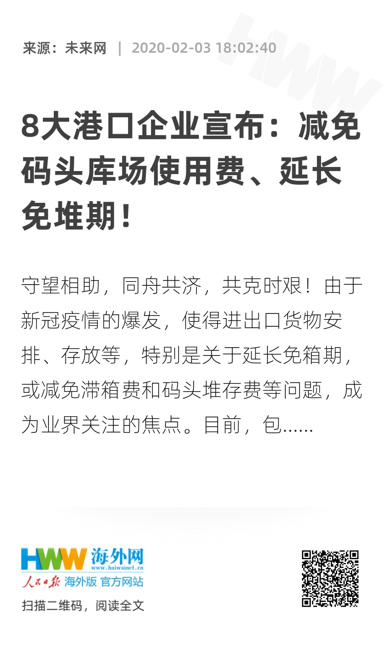守望相助,同舟共济,共克时艰!由于新冠疫情的爆发,使得进出口货物安排、存放等,特别是关于延长免箱期,或减免滞箱费和码头堆存费等问题,成为业界关注的焦点。