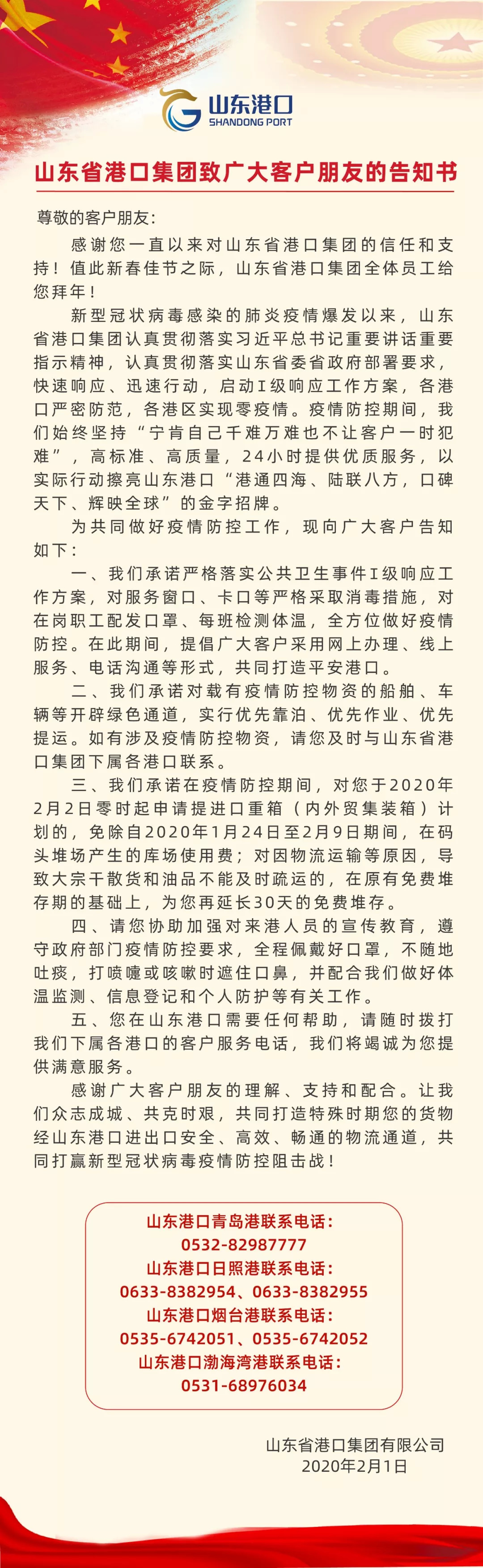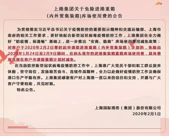 2月1日,山东港口集团发布通知称,对2020年2月2日零时起,申请提进口重箱(内外贸集装箱)计划的,免除2020年1月24日至2月9日期间,在码头堆场产生的库场使用费。