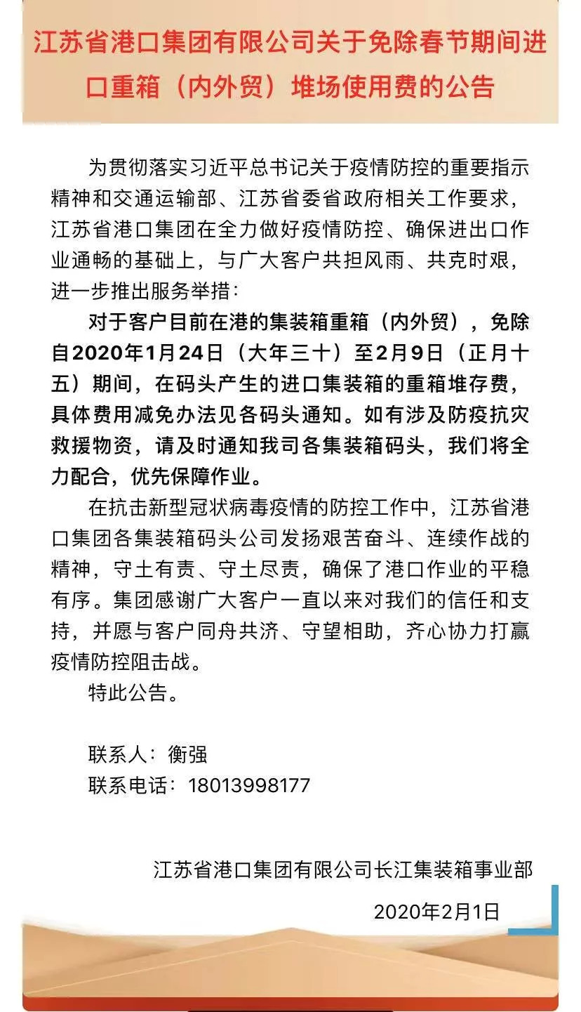 2月1日,江苏省港口集团发布通知称,免除自2020年1月24日(大年三十)至2月9日(正月十五)期间,在码头产生的进口集装箱的重箱堆存费。
