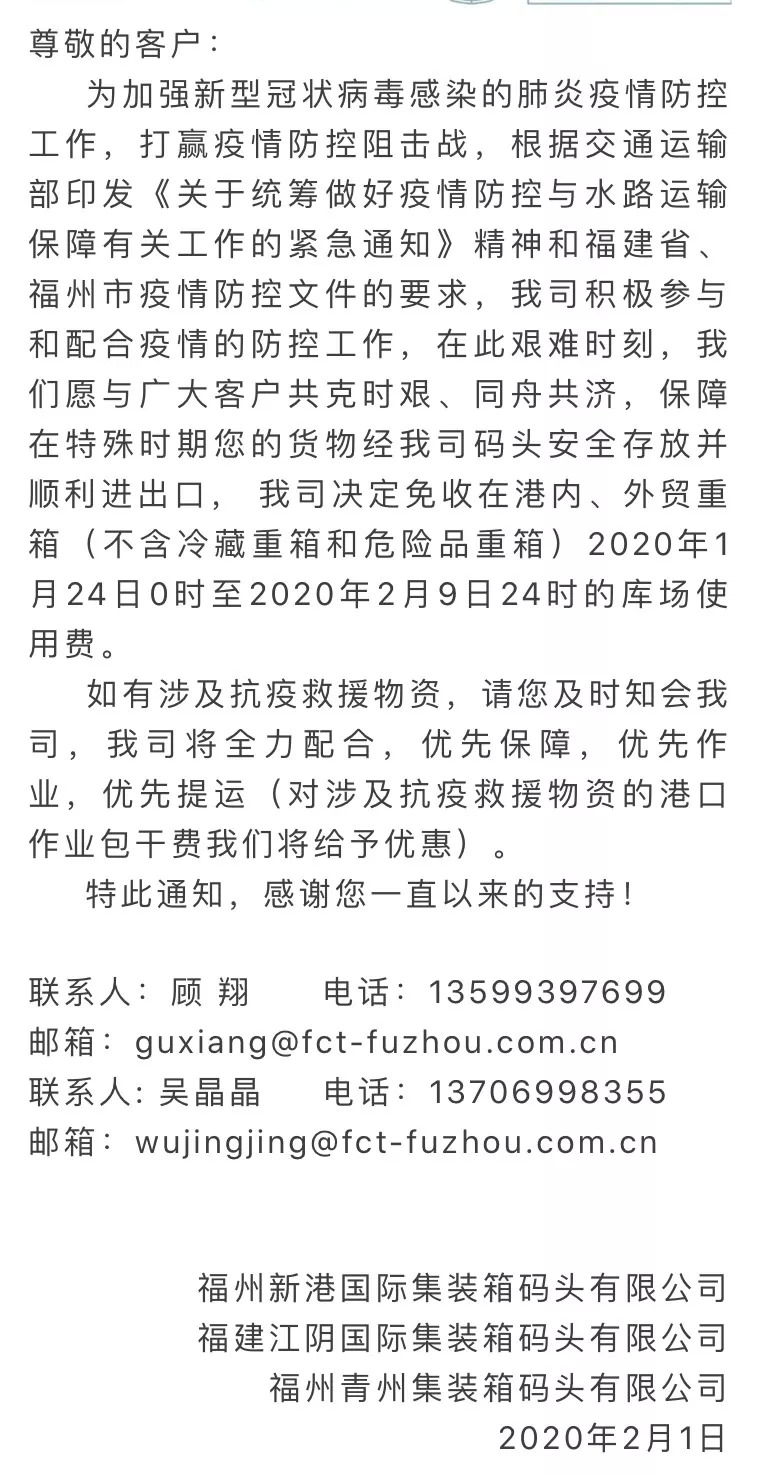 2月1日,福州新港国际集装箱码头有限公司、福建江阴国际集装箱码头有限公司、福州青州集装箱码头有限公司联合发布通知称,免收在港内、外贸重箱(不含冷藏重箱和危险品重箱)2020年1月24日0时至2020年2月9日24时的库场使用费。