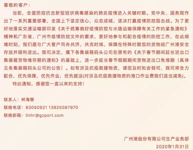 广州港股份有限公司同时强调,如有涉及抗疫救援物资的,请及时通知,将全力配合,优先保障,优先作业,优先提运,并将适当减免涉及抗疫救援物资的港口作业费。