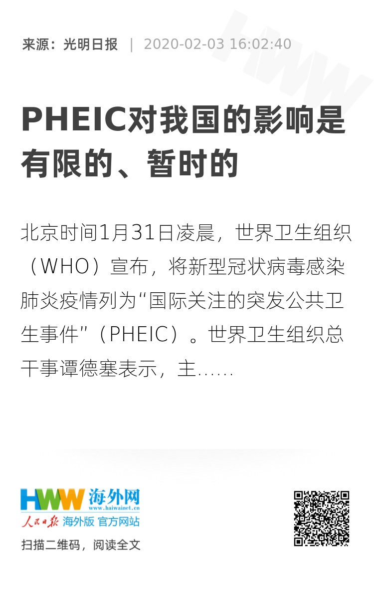 PHEIC不等于疫区(国),但是宣布PHEIC会对疫情发生的国家和地区产生一定的影响,这也是毋庸置疑的。不过,我们相信,这些影响毕竟是有限的,也是暂时的。