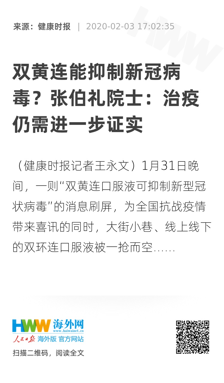 (健康时报记者王永文)1月31日晚间,一则“双黄连口服液可抑制新型冠状病毒”的消息刷屏,为全国抗战疫情带来喜讯的同时,大街小巷、线上线下的双环连口服液被一抢而空!但随之而来的一边是普通民众抢不到该药物的心理恐慌,另一边是精英大众的普遍质疑,双黄连系列药物对新型冠状病毒究竟有无疗效?