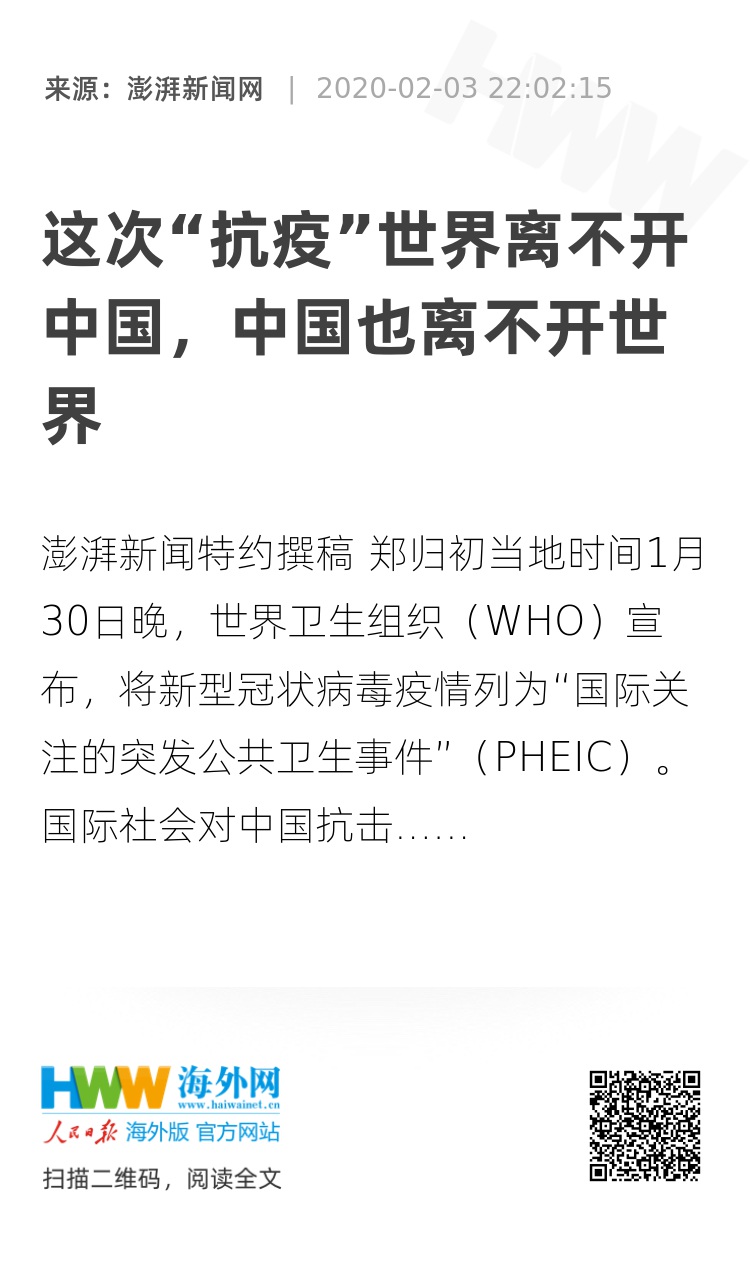 当地时间1月30日晚,世界卫生组织(WHO)宣布,将新型冠状病毒疫情列为“国际关注的突发公共卫生事件”(PHEIC)。国际社会对中国抗击疫情的关注程度达到一个小高潮。辩证来说,中国“战疫”也有不小的积极国际影响,我们可以从三个方面来看——国外怎么看我们?我们怎么看国外?大家怎么看大家?