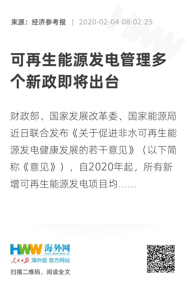 “新的管理机制建立后,随着以收定支、新增项目不新欠以及合规项目纳入补贴清单等措施的落地,可再生能源发电项目将具有稳定的收益。金融机构可据此作为评估项目的依据,按照市场化原则,对绿色能源予以支持,共同促进可再生能源行业可持续发展。”上述财政部相关负责人称。