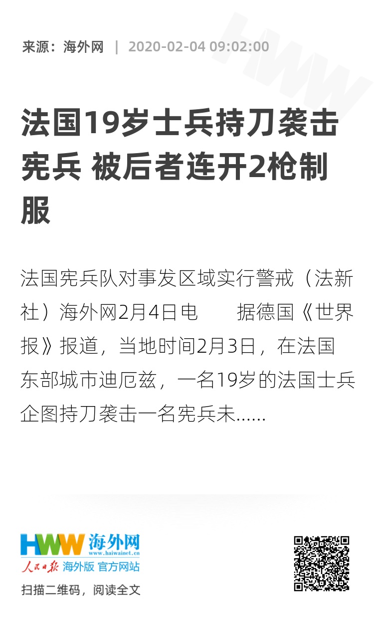 海外网2月4日电 据德国《世界报》报道,当地时间2月3日,在法国东部城市迪厄兹,一名19岁的法国士兵企图持刀袭击一名宪兵未遂,遭该宪兵开枪射伤并制服。法国司法机构称,不排除恐怖袭击的可能。