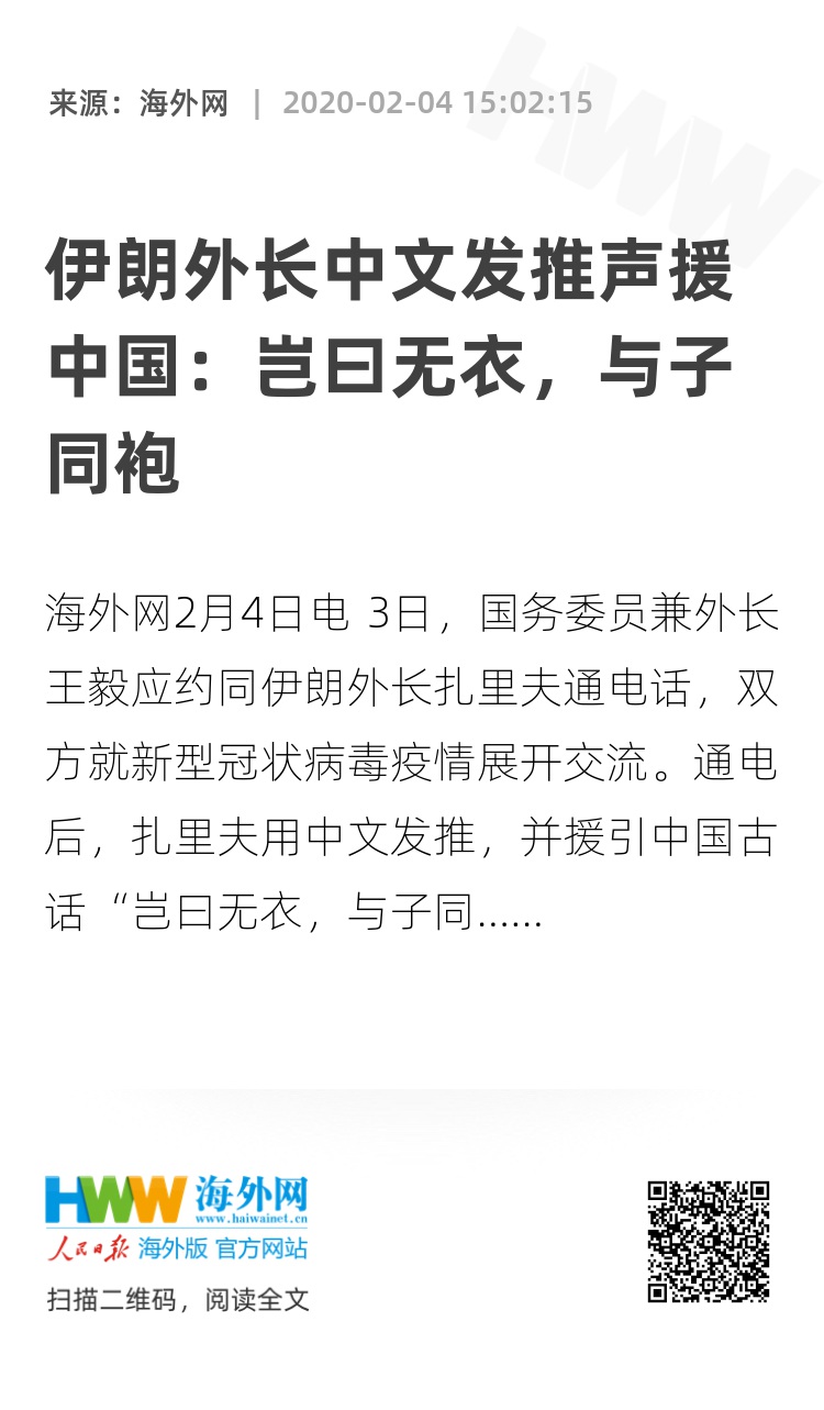 海外网2月4日电 3日,国务委员兼外长王毅应约同伊朗外长扎里夫通电话,双方就新型冠状病毒疫情展开交流。通电后,扎里夫用中文发推,并援引中国古话“岂曰无衣,与子同袍”,称“伊朗始终与中国站在一起”。