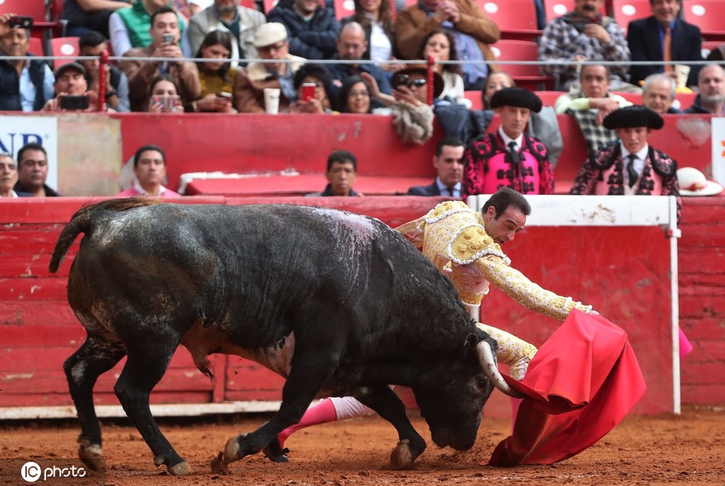 当地时间2020年2月3日,墨西哥城,西班牙斗牛士Enrique Ponce参加斗牛表演,与公牛搏斗。