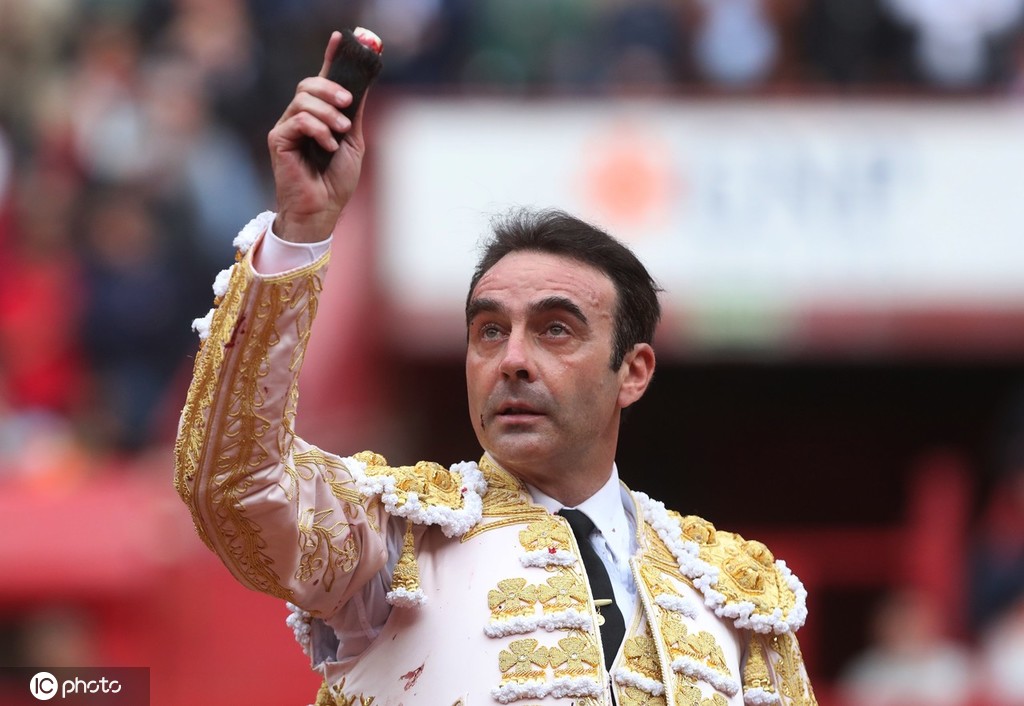 当地时间2020年2月3日,墨西哥城,西班牙斗牛士Enrique Ponce参加斗牛表演,与公牛搏斗。