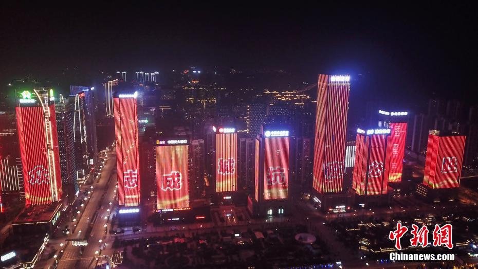 2月4日晚,航拍“众志成城、抗疫必胜”楼体灯光。当晚,贵阳市观山湖区金融城九栋高楼楼体上打出“武汉加油、中国加油”“众志成城、抗疫必胜”等字样的楼体灯光,鼓励民众积极抗疫。中新社记者 瞿宏伦 摄