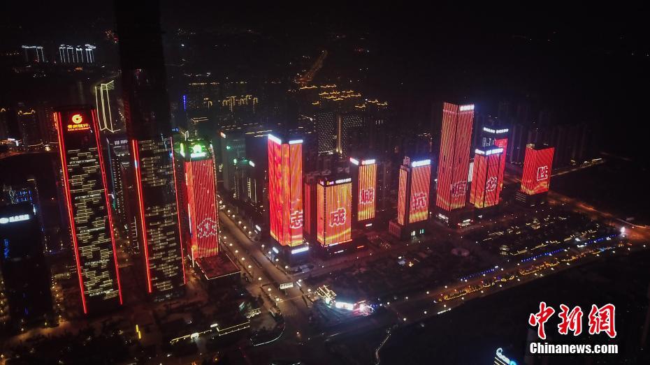 2月4日晚,航拍“众志成城、抗疫必胜”楼体灯光。当晚,贵阳市观山湖区金融城九栋高楼楼体上打出“武汉加油、中国加油”“众志成城、抗疫必胜”等字样的楼体灯光,鼓励民众积极抗疫。中新社记者 瞿宏伦 摄