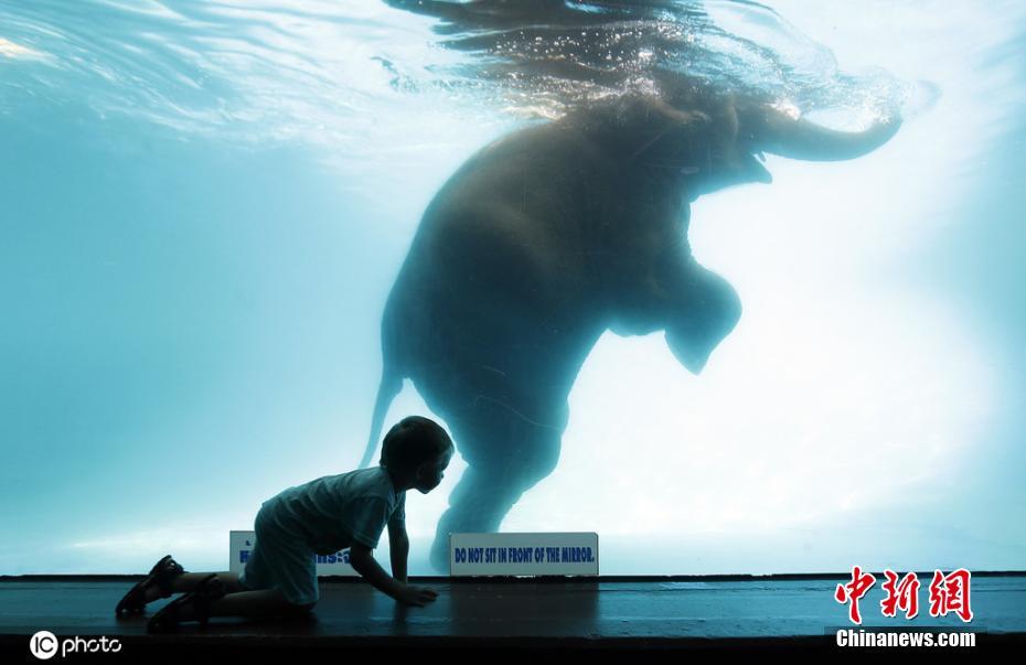 泰国大象泳池中潜水 吸引游客隔窗观看