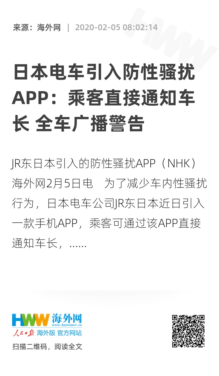 海外网2月5日电 为了减少车内性骚扰行为,日本电车公司JR东日本近日引入一款手机APP,乘客可通过该APP直接通知车长,车长则通过车内广播即时全车通报。