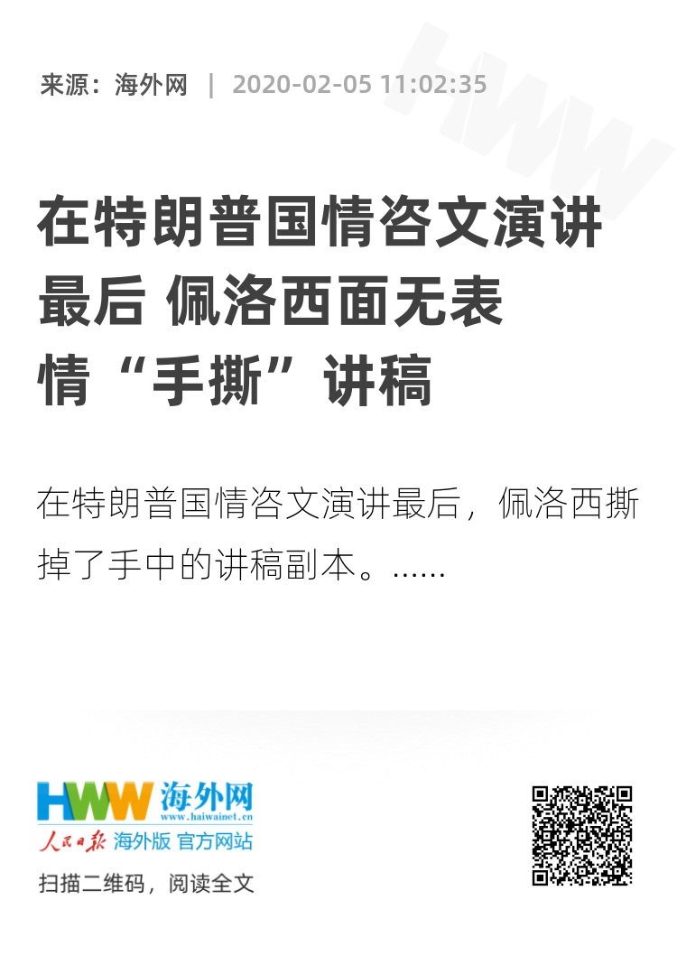 报道指出,特朗普此次的国情咨文演讲活动火药味十足。在演讲开始前,特朗普就拒绝与佩洛西进行握手,而伸出手的佩洛西则只能露出尴尬的微笑。演讲期间,佩洛西在大多数时间内都避免注视特朗普,而是选择阅读事先准备好的讲稿,并不时扫视会场。(海外网 赵健行)