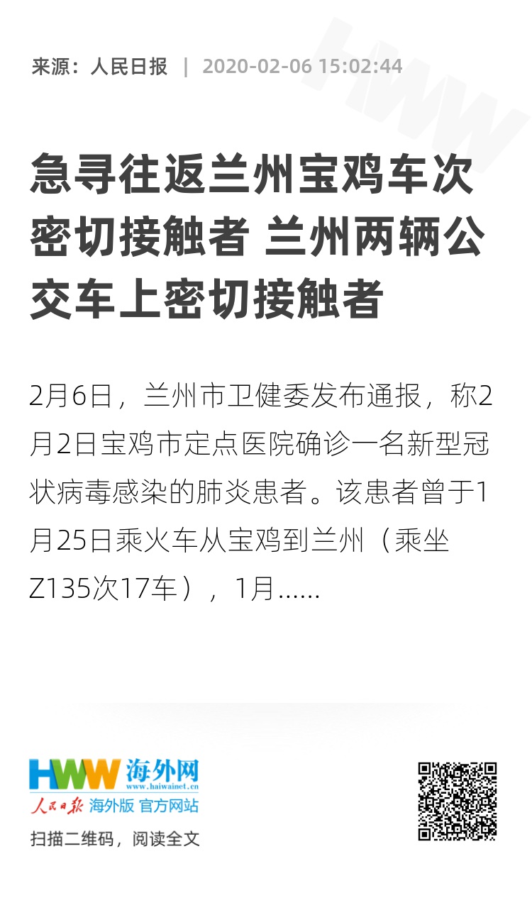 2月6日,兰州市卫健委发布通报,称2月2日宝鸡市定点医院确诊一名新型冠状病毒感染的肺炎患者。该患者曾于1月25日乘火车从宝鸡到兰州(乘坐Z135次17车),1月27日乘高铁从兰州到宝鸡南(乘坐G2096次2车),1月27日12:33分乘公交车从宝鸡南站到火车站(乘坐28路空调公交车)、约13:30分到14:00分乘公交车从火车站到群众路(乘坐37路普通公交车)。