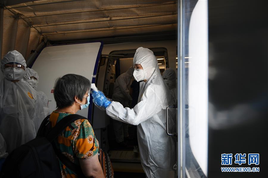 2月5日,在新加坡樟宜机场,乘务人员为登机旅客检测体温。新华社发(邓智炜摄)