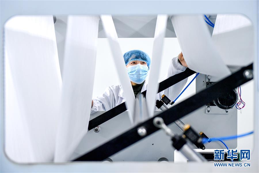 2月6日,在浙江省湖州市长兴县的浙江惠龙医疗科技股份有限公司,工人在生产医用敷料。新华社发(谭云俸 摄)