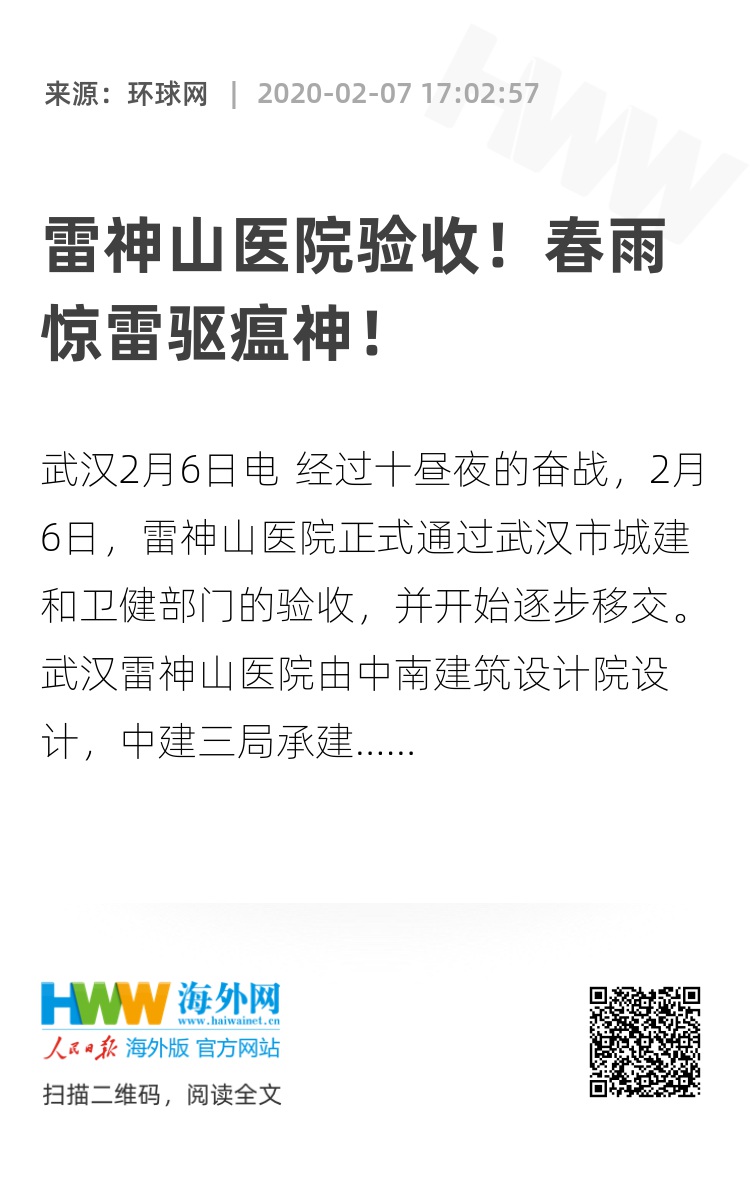 新华社武汉2月6日电 经过十昼夜的奋战,2月6日,雷神山医院正式通过武汉市城建和卫健部门的验收,并开始逐步移交。