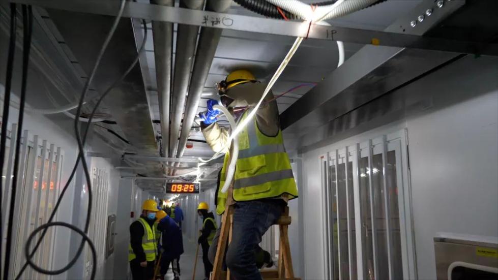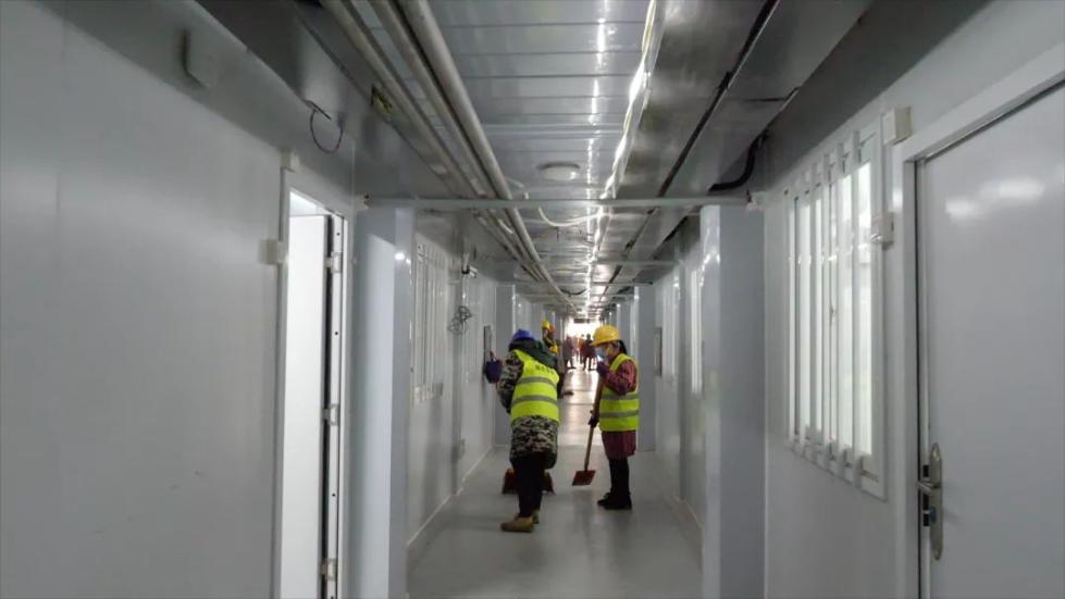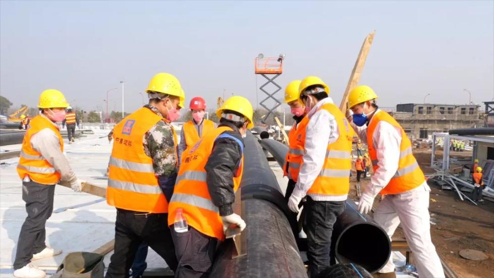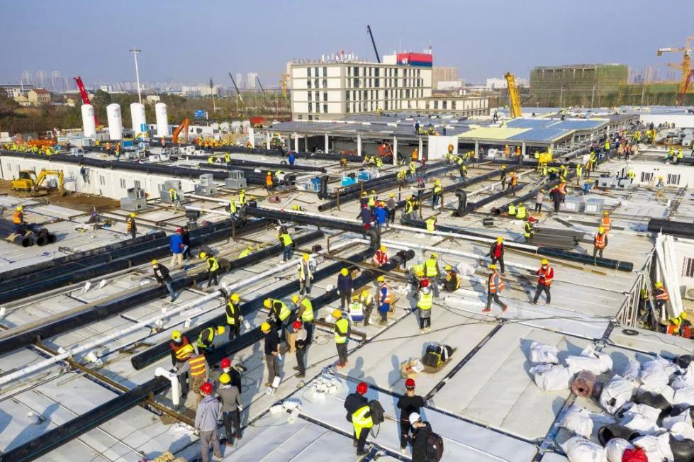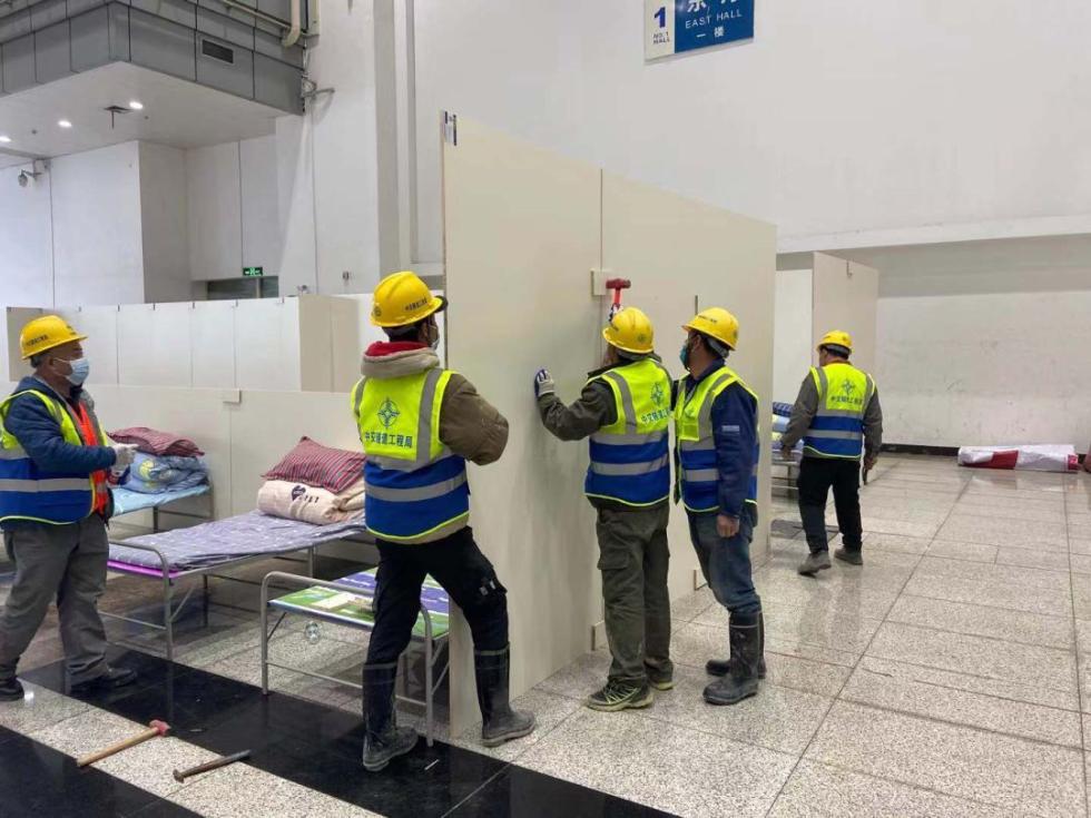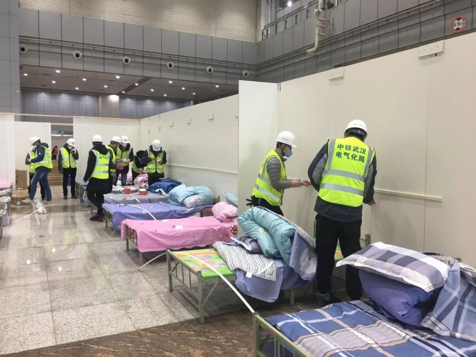 2月4日、5日,中国铁建中铁十一局集团、中铁十四局集团连续两个昼夜抢建武汉国际会展中心、武汉客厅“方舱医院”,在最短的时间内抽调了500余人次,自带工具组成应急支援专业队伍,圆满完成病床隔板安装、临电安装和门洞、吊顶、大门等施工任务。