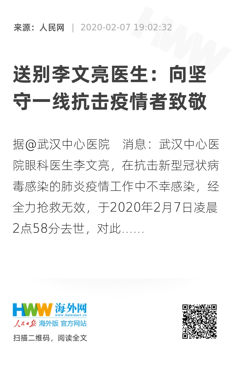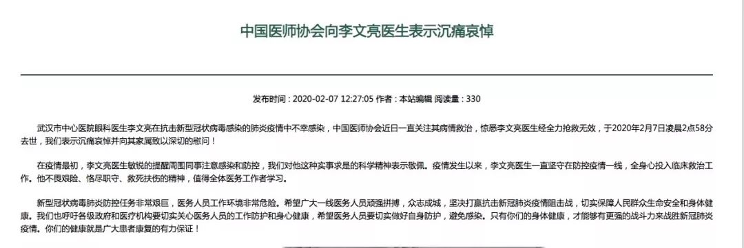 武汉市中心医院眼科医生李文亮在抗击新型冠状病毒感染的肺炎疫情中不幸感染,中国医师协会近日一直关注其病情救治,惊悉李文亮医生经全力抢救无效,于2020年2月7日凌晨2点58分去世,我们表示沉痛哀悼并向其家属致以深切的慰问!
