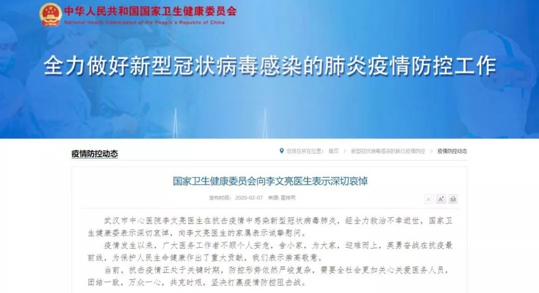 7日,国家卫健委向李文亮医生表示深切哀悼: