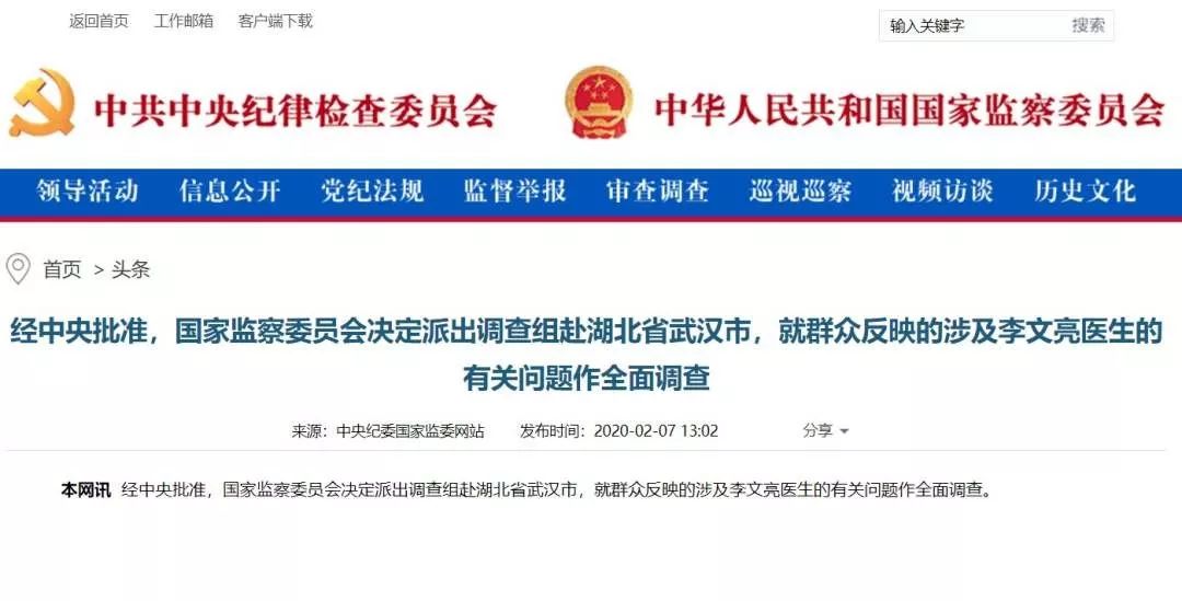 7日,经中央批准,国家监察委员会决定派出调查组赴湖北省武汉市,就群众反映的涉及李文亮医生的有关问题作全面调查。