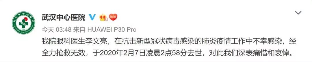据@武汉中心医院 消息:武汉中心医院眼科医生李文亮,在抗击新型冠状病毒感染的肺炎疫情工作中不幸感染,经全力抢救无效,于2020年2月7日凌晨2点58分去世,对此,医院方面深表痛惜和哀悼。
