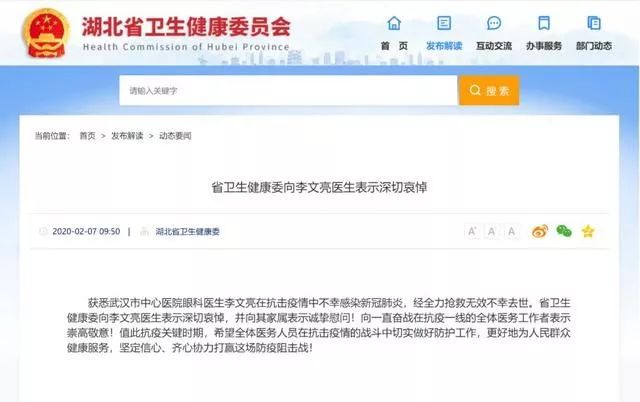 7日上午,湖北省卫生健康委员会向李文亮医生表示深切哀悼: