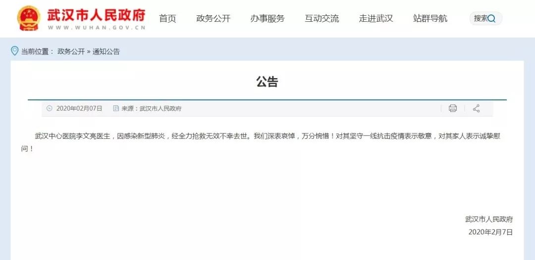 7日上午,武汉市政府网站发布公告: