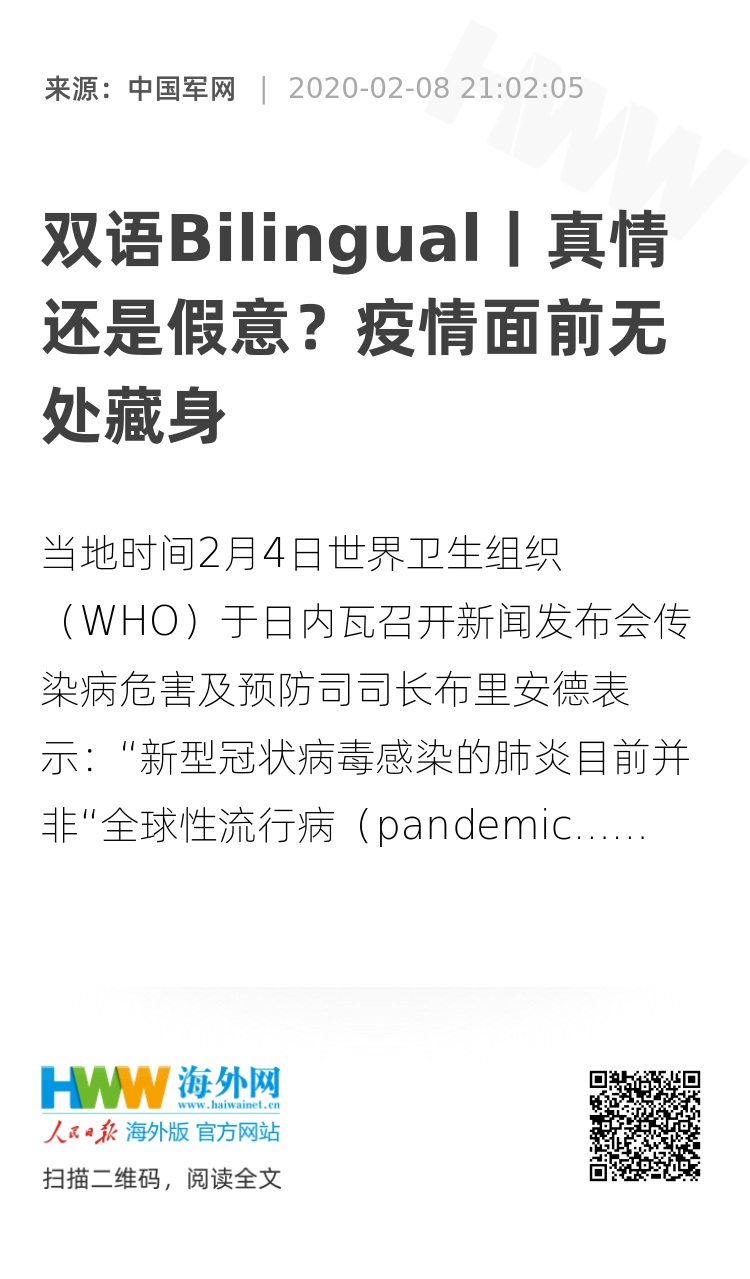 中国外交部发言人华春莹在2月6日举行的网上记者会上回应该文作者: