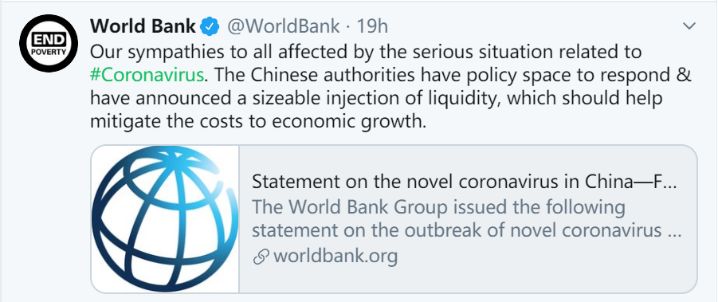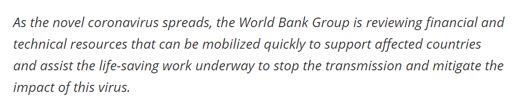 2月3日世界银行就疫情发表声明,其中提到:随着新型冠状病毒扩散,世界银行集团正在评估可快速动员的资金和技术资源,以支持受疫情影响的国家,并援助正在进行的救治工作,阻止病毒传播并减轻其影响。