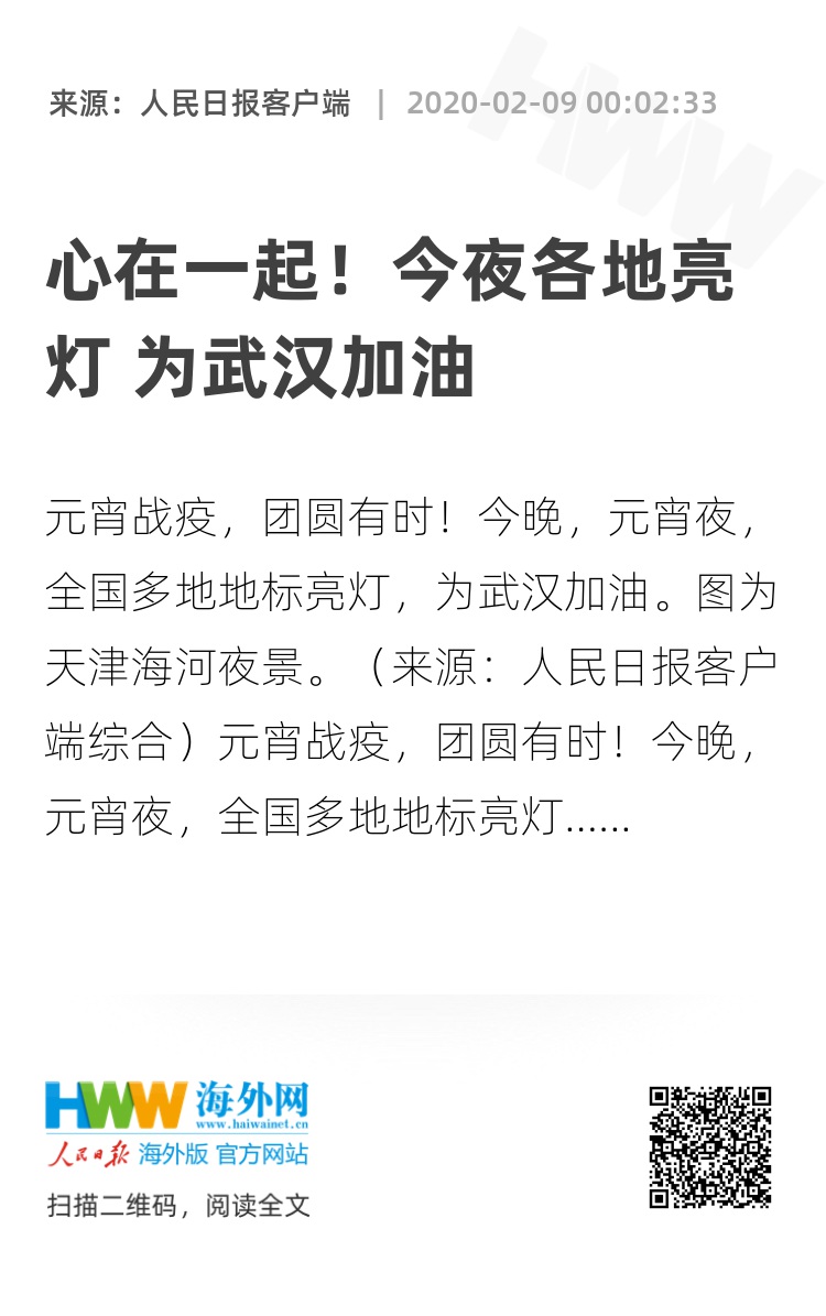 元宵战疫,团圆有时!今晚,元宵夜,全国多地地标亮灯,为武汉加油。图为天津海河夜景。(来源:人民日报客户端综合)