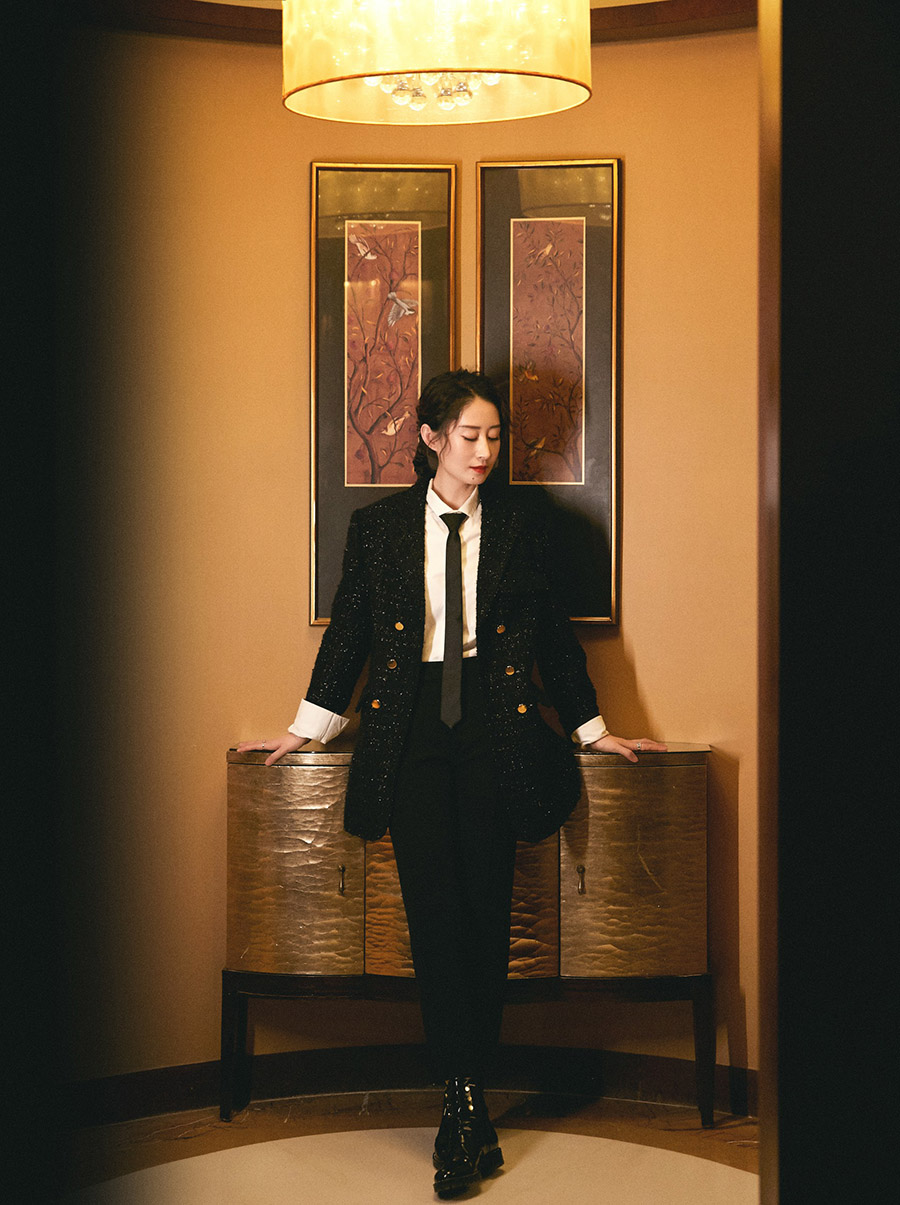 刘敏涛一组帅气西装写真曝光,照片中她身穿黑色闪光西装内搭白衬衫与休闲领带。帅气逼人,黑色修身小脚裤加上黑色漆皮靴,腿部线条自然修长,将身材完美展现。