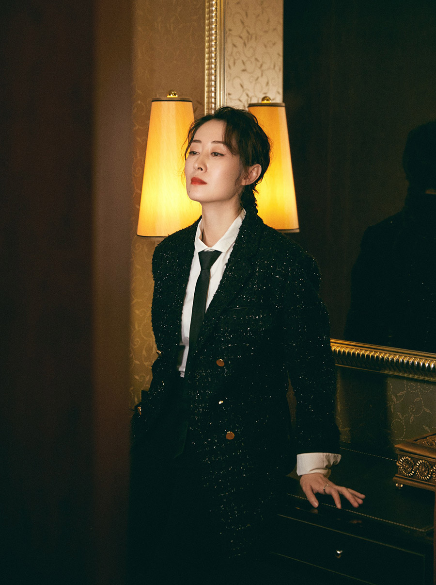 刘敏涛一组帅气西装写真曝光,照片中她身穿黑色闪光西装内搭白衬衫与休闲领带。帅气逼人,黑色修身小脚裤加上黑色漆皮靴,腿部线条自然修长,将身材完美展现。