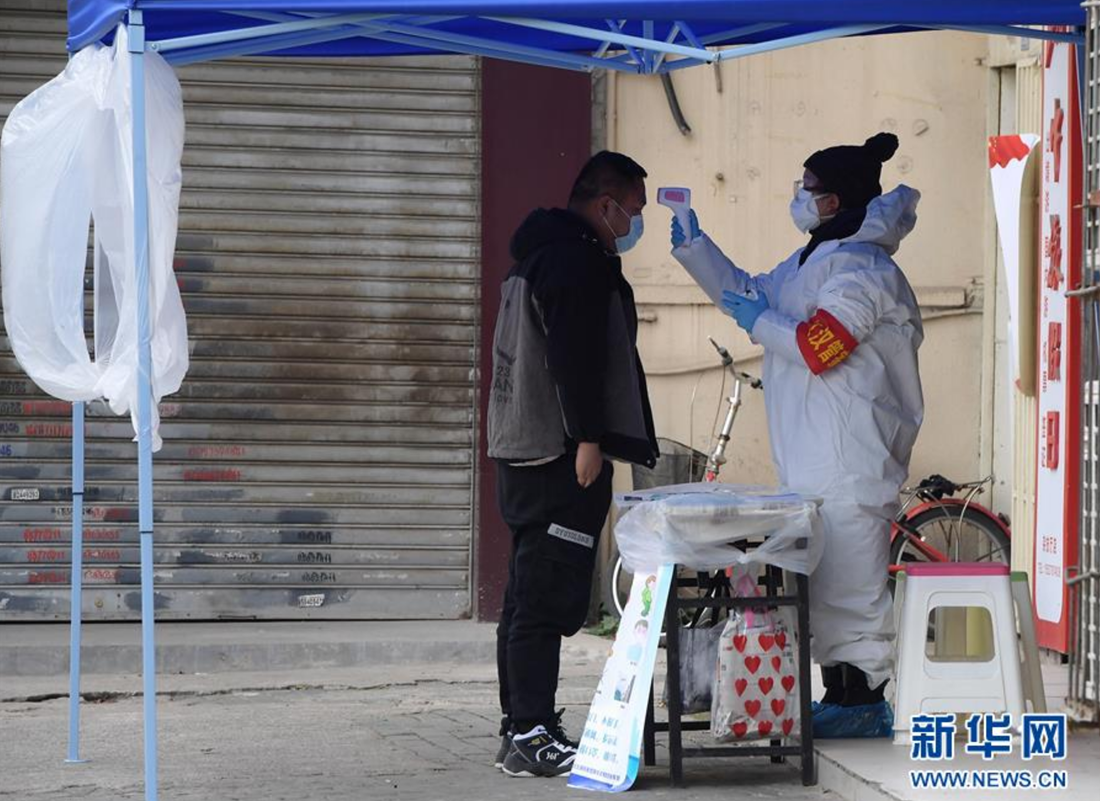 2月10日,武汉市园林局支援德望社区的一位下沉工作人员在值守的小区门口为来访者测量体温。 新华社记者李贺摄
