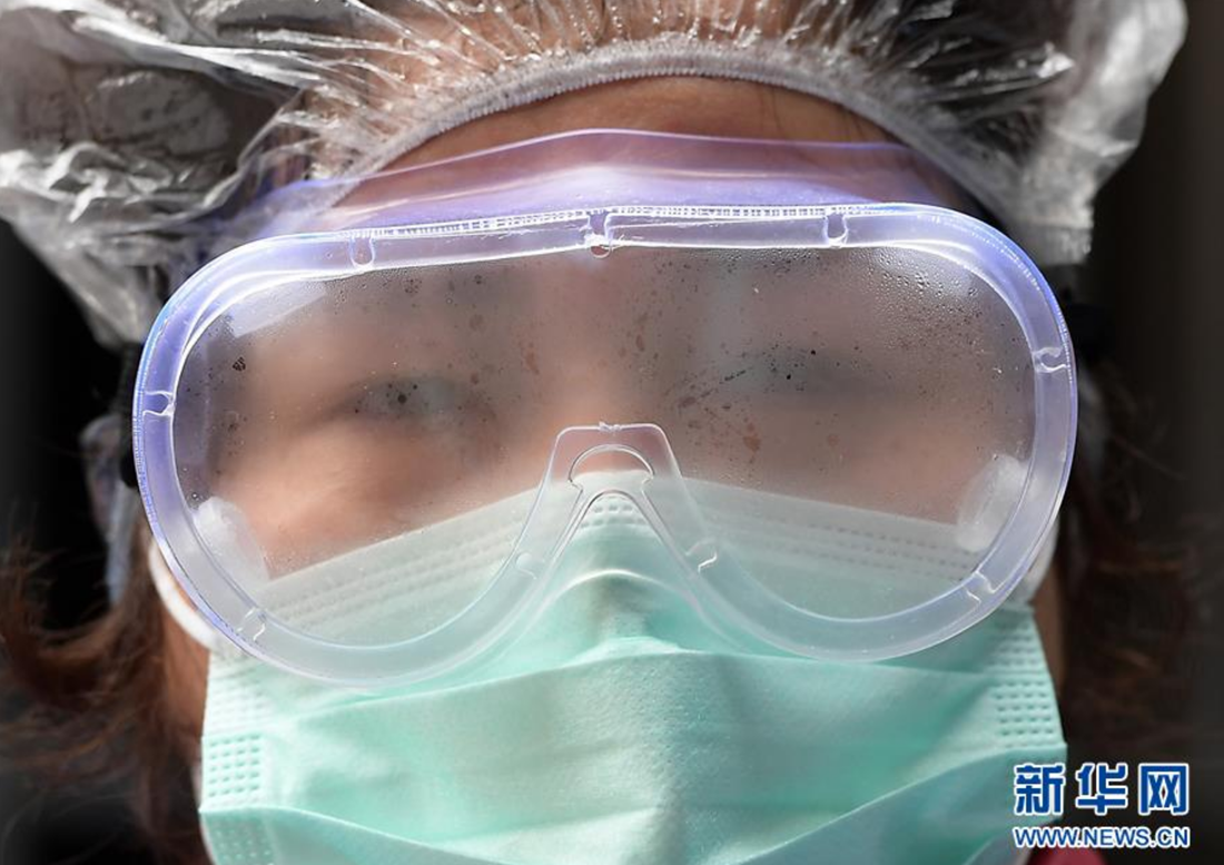 2月10日,从辖区返回德望社区居委会的工作人员护目镜上已起雾。 新华社记者李贺摄