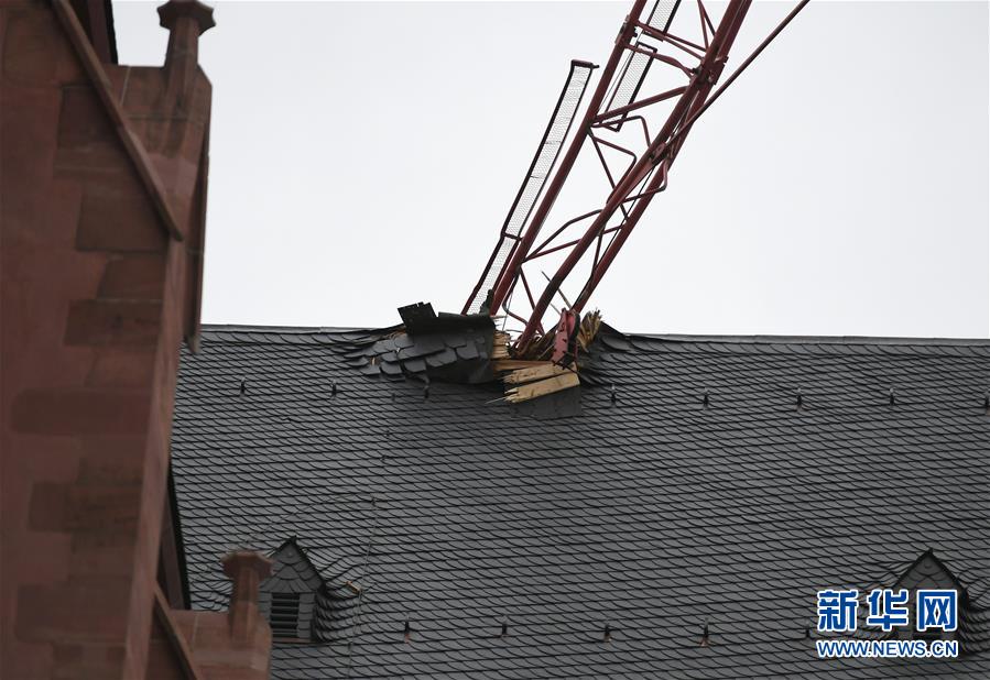 这是2月10日拍摄的德国法兰克福大教堂受损顶部。 一场名为“萨比娜”的风暴自9日起袭击德国大部分地区。受风暴影响,一台起重机的悬臂被推入法兰克福大教堂的屋顶,致使屋顶受损。 新华社记者 逯阳 摄