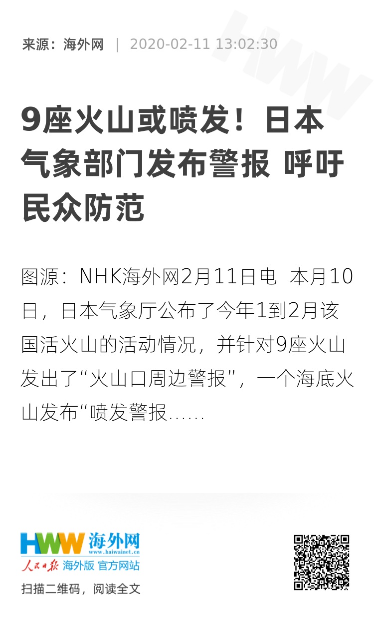 据日本放送协会(NHK)11日报道,当天,除公布活火山的活动状况外,日本气象厅还公布了需要采取警戒的几个地区。报告显示,今年1月至2月间,日本火山喷发及相关活动较为活跃。