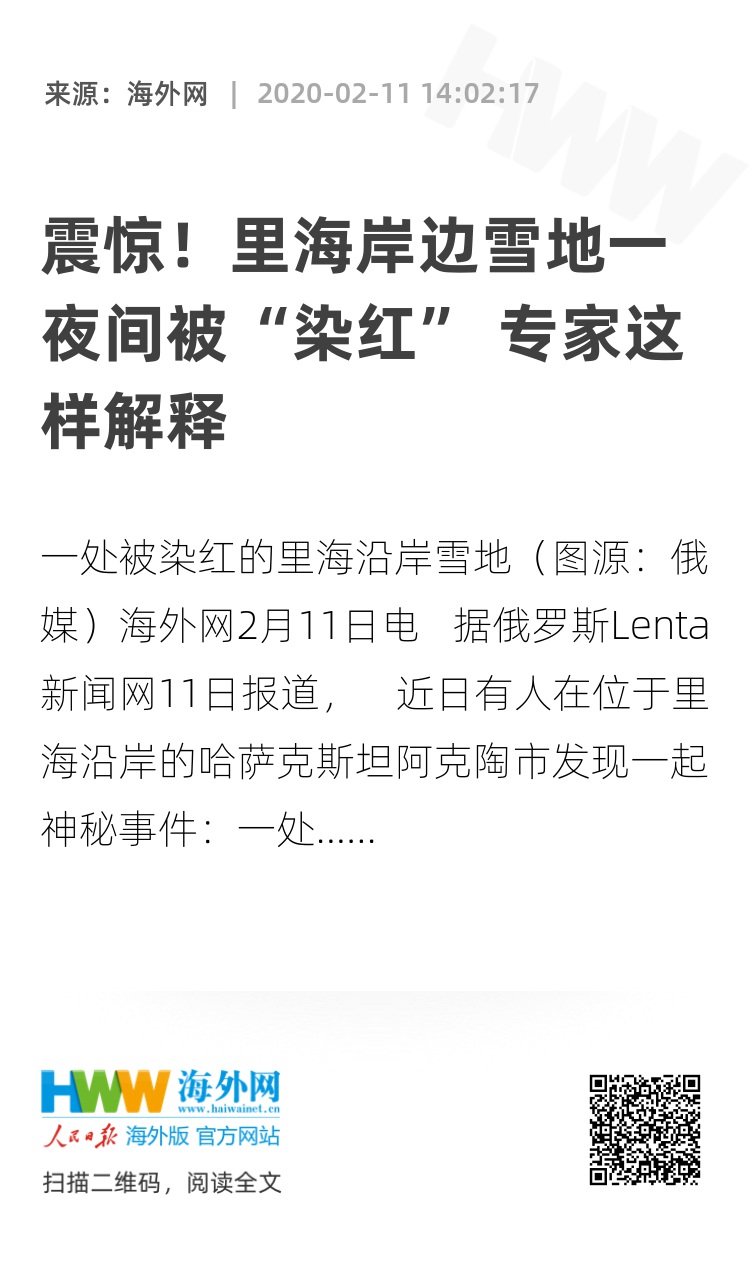 海外网2月11日电 据俄罗斯Lenta新闻网11日报道, 近日有人在位于里海沿岸的哈萨克斯坦阿克陶市发现一起神秘事件:一处海滩雪地一夜间忽然大面积变成血红色,猩红色的雪地和周围白雪皑皑的一片形成鲜明对比,远远望过去好似一大滩血迹。