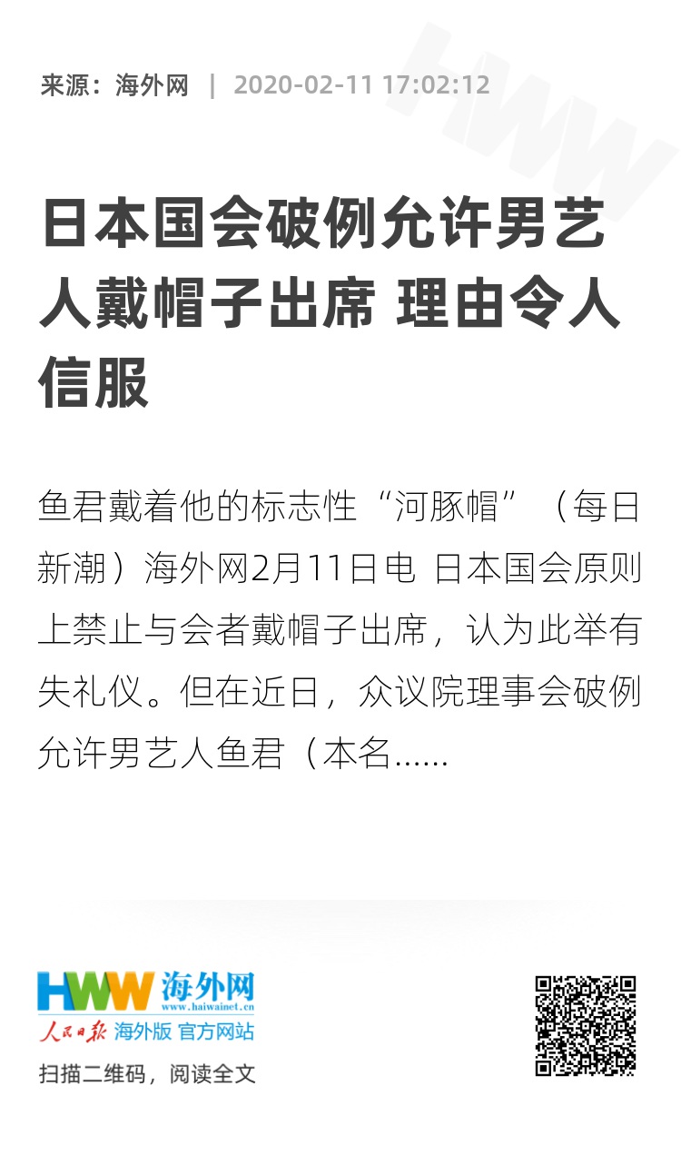 海外网2月11日电 日本国会原则上禁止与会者戴帽子出席,认为此举有失礼仪。但在近日,众议院理事会破例允许男艺人鱼君(本名宫泽正之)戴帽子出席一场调查会,还给出了一个令人信服的理由。