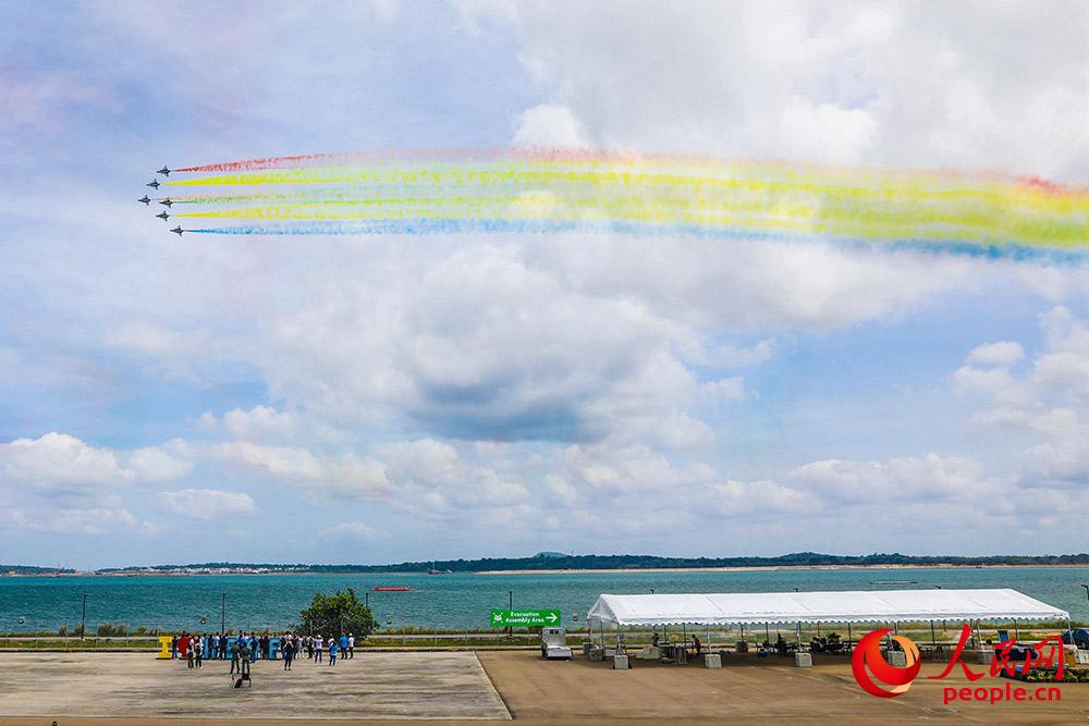 人民网新加坡2月10日电(黄子娟 朱姜海)地面热浪滚滚,空中战机轰鸣。 碧海蓝天上,6架蓝白红相间、喷涂五星红旗的歼-10飞机时而盘旋、时而俯冲,队形转换灵活自如。2月8日,空军八一飞行表演队在新加坡樟宜展览中心进行检验性飞行,为2月11日至16日的新加坡航展飞行表演做准备,这也是空军八一飞行表演队抵达新加坡后的首场飞行。
