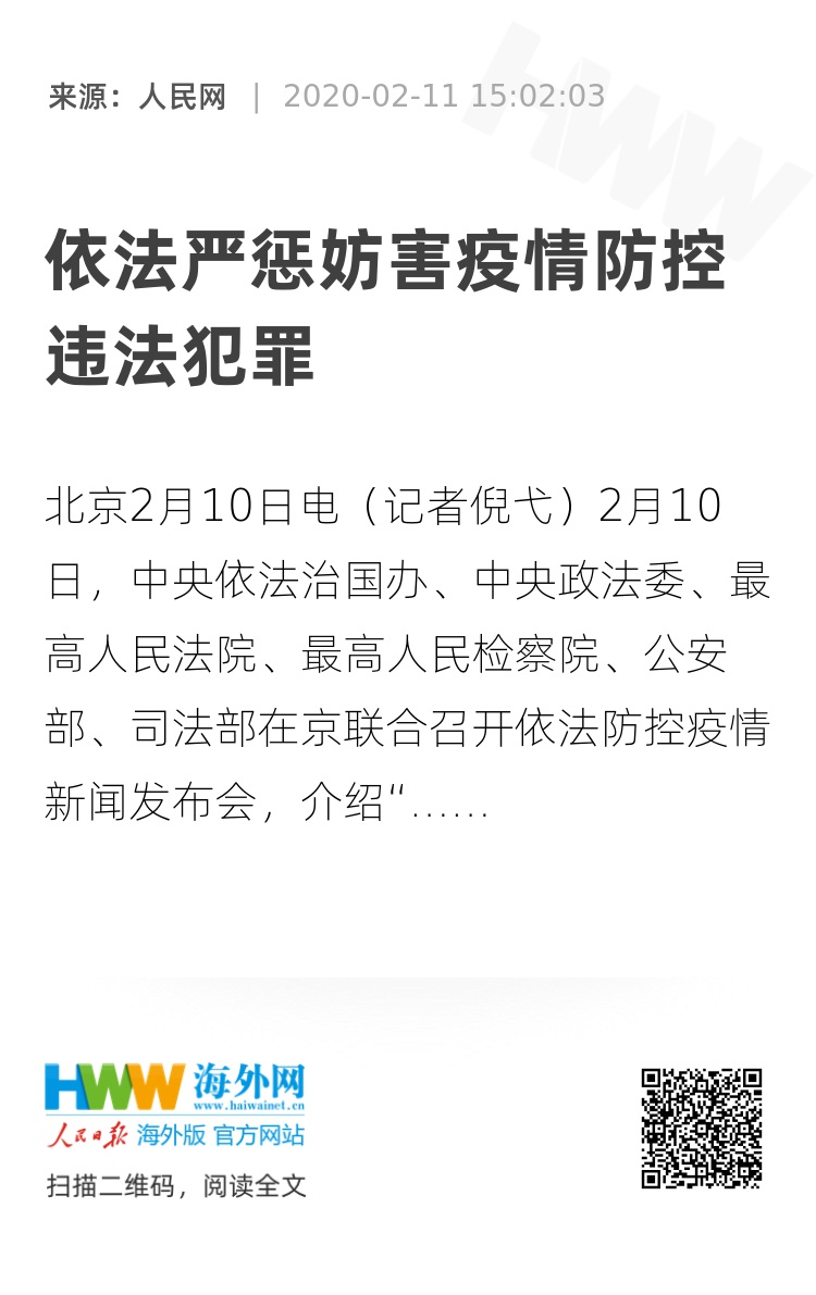 人民网北京2月10日电(记者倪弋)2月10日,中央依法治国办、中央政法委、最高人民法院、最高人民检察院、公安部、司法部在京联合召开依法防控疫情新闻发布会,介绍“两高两部”制定实施《关于依法惩治妨害新型冠状病毒感染肺炎疫情防控违法犯罪的意见》的有关情况。