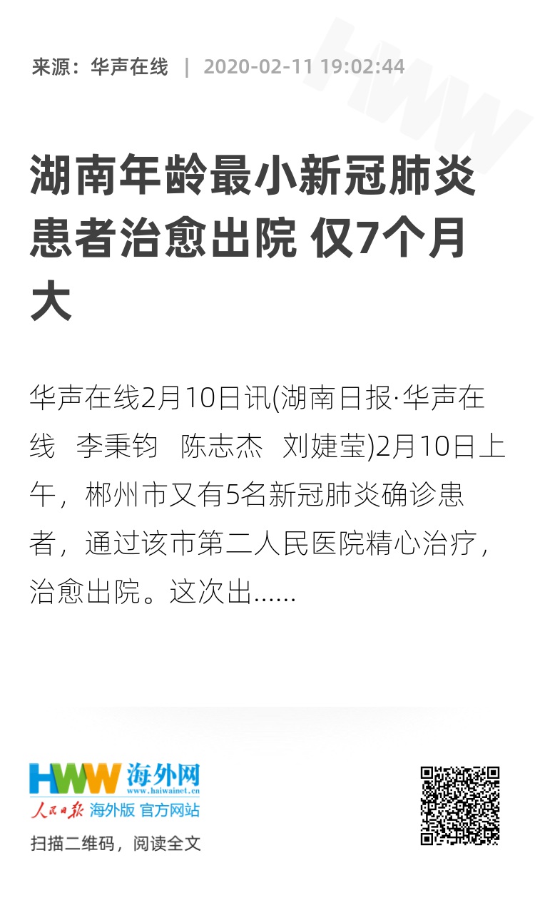 华声在线2月10日讯(湖南日报·华声在线 李秉钧 陈志杰 刘婕莹)2月10日上午,郴州市又有5名新冠肺炎确诊患者,通过该市第二人民医院精心治疗,治愈出院。这次出院的患者中,年龄最小的仅7个月。郴州市第二人民医院医生介绍,这是目前我省确诊病例治愈出院者中年龄最小的。