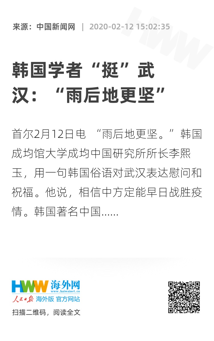 中新网首尔2月12日电 “雨后地更坚。”韩国成均馆大学成均中国研究所所长李熙玉,用一句韩国俗语对武汉表达慰问和祝福。他说,相信中方定能早日战胜疫情。