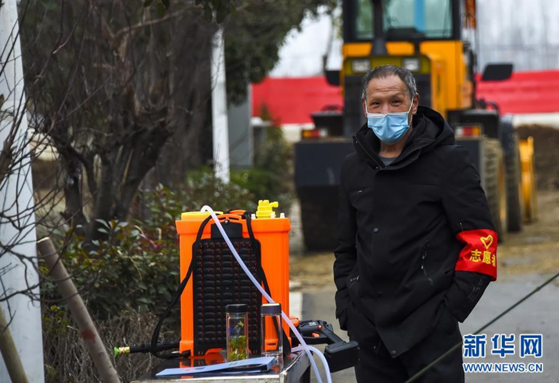 2月10日,孝感市孝南区陡岗镇袁湖村的疫情防控志愿者在村口的应急通道处值守。 新华社记者胡虎虎摄