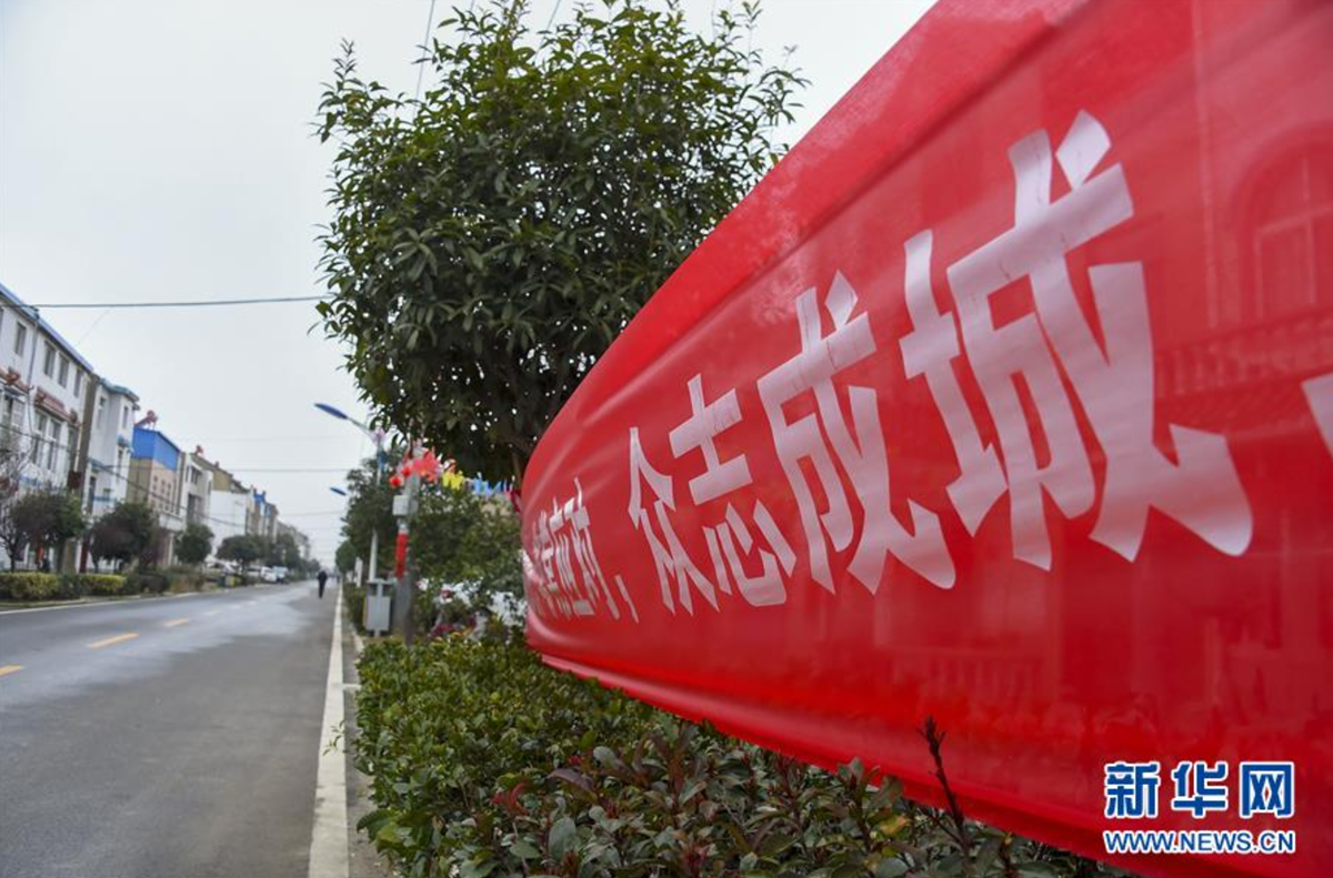这是在孝感市孝南区陡岗镇袁湖村拍摄的一处抗疫标语(2月10日摄)。 新华社记者胡虎虎摄农村是抗击新冠肺炎疫情的薄弱环节。在疫情严重的湖北省孝感市,农村防疫做得怎样?面临哪些挑战?记者10日来到孝南区陡岗镇袁湖村实地探访。袁湖村不大,全村1600多人,实际在村1104人。因为距离孝感市区不过几公里,人员流动性强,武汉返乡人员多,疫情防控难度不小。