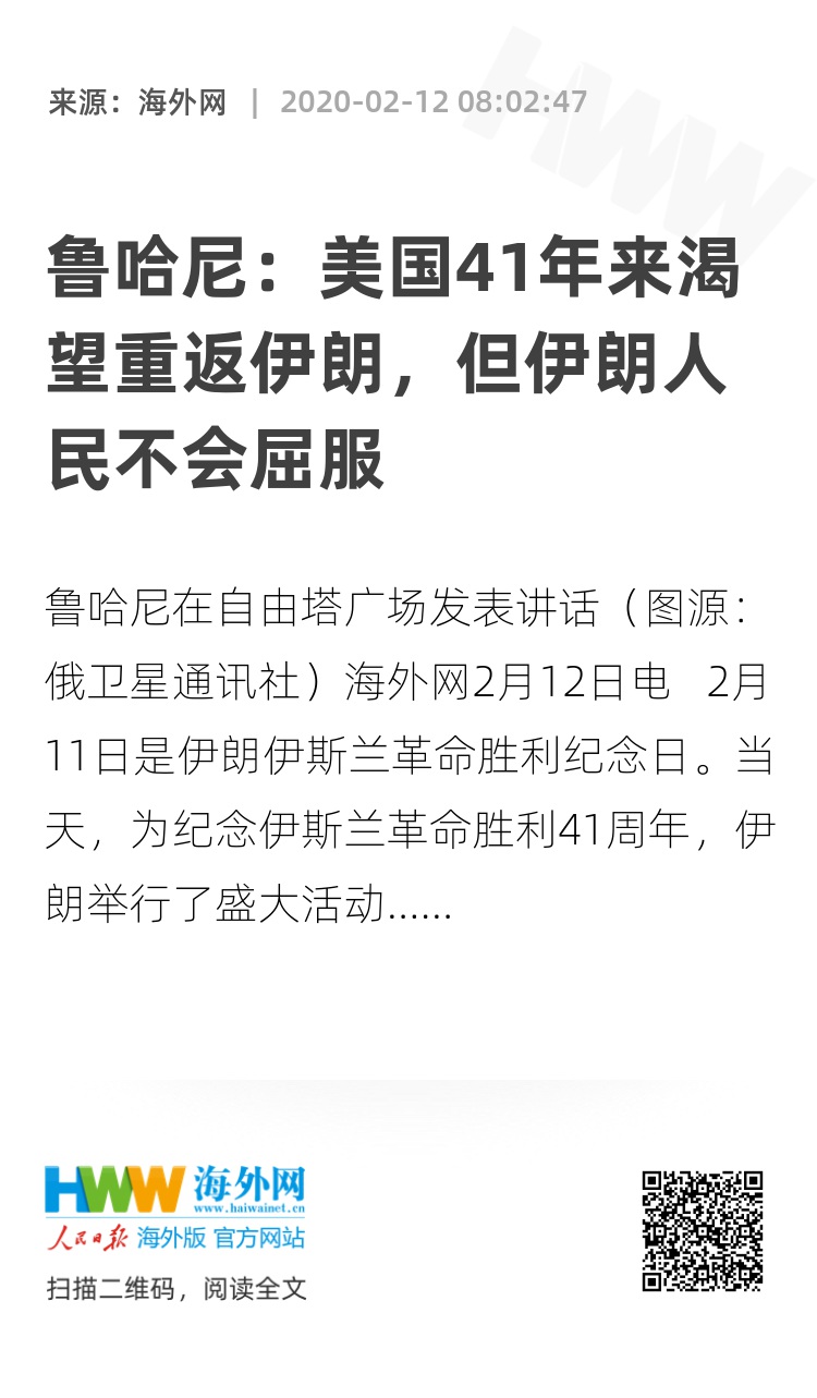 俄罗斯卫星通讯社11日援引鲁哈尼的话称,美国难以容忍伊朗革命是正常的,“因为它知道伊朗在西亚地区的强大力量”。