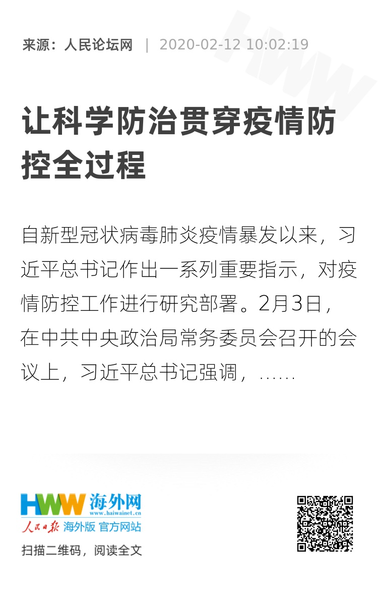 自新型冠状病毒肺炎疫情暴发以来,习近平总书记作出一系列重要指示,对疫情防控工作进行研究部署。2月3日,在中共中央政治局常务委员会召开的会议上,习近平总书记强调,按照坚定信心、同舟共济、科学防治、精准施策的要求,尽快找差距、补短板,切实做好各项防控工作,同时间赛跑、与病魔较量,坚决遏制疫情蔓延势头,坚决打赢疫情防控阻击战。习近平总书记反复强调的“科学防治”,为我们做好疫情防控工作提供了重要遵循。