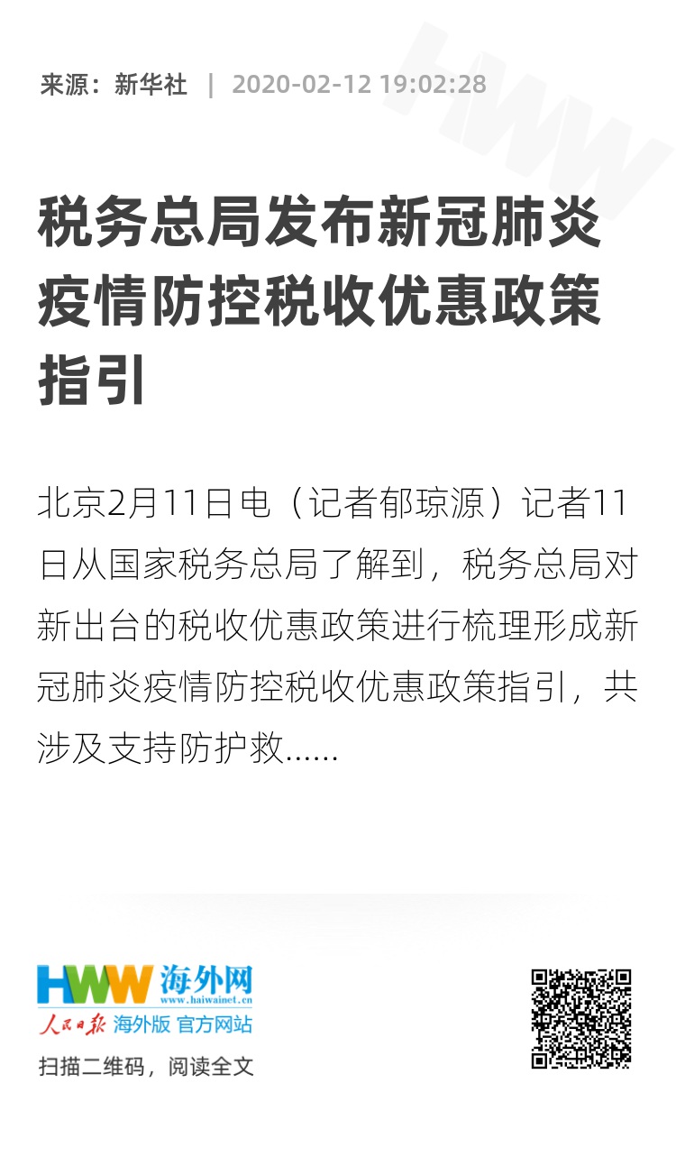 新华社北京2月11日电(记者郁琼源)记者11日从国家税务总局了解到,税务总局对新出台的税收优惠政策进行梳理形成新冠肺炎疫情防控税收优惠政策指引,共涉及支持防护救治、支持物资供应、鼓励公益捐赠、支持复工复产四个方面12项政策。