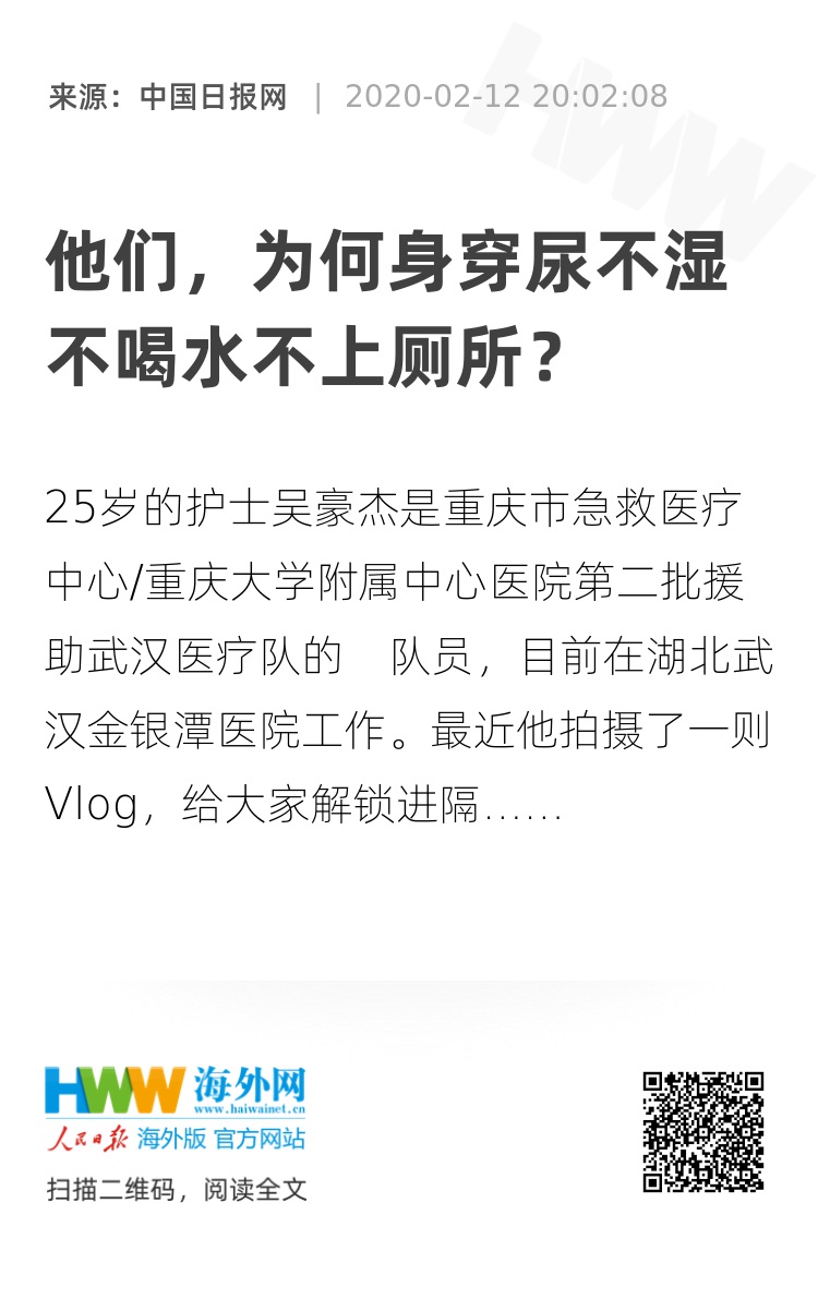 最近他拍摄了一则Vlog,给大家解锁进隔离病病房前是如何穿防护服的。看完你就知道,他们为什么要用尿不湿、为什么不喝水不去上厕所了。(记者谭英姿)